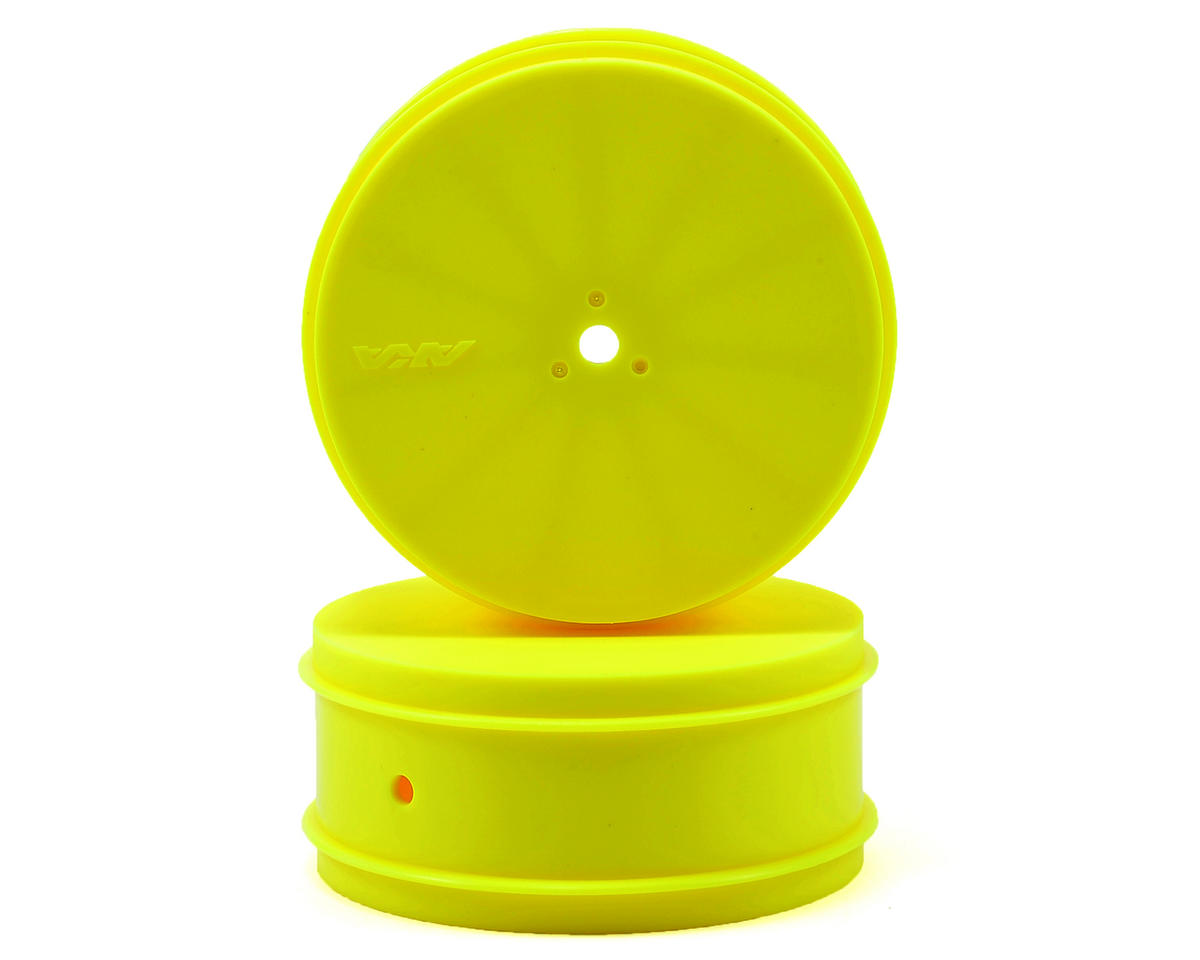 This is a pack of two yellow AKA Racing "EVO" 2.2 4wd Front Wheels. These wheels are compatible with the TLR 22-4. AKA 1/10 EVO wheels have taken 1/10 scale buggy racing to the next level by adapting the L-shaped 1/8 buggy bead to the smaller 1/10 wheels. The EVO wheel has been redesigned to be stronger and stiffer. The EVO wheel features pre-punched vent holes in the wheel, combined with the L-shape bead that makes tire mounting much easier by giving you a wider and easily accessible gluing surface to ensure a strong bond between the tire and wheel.