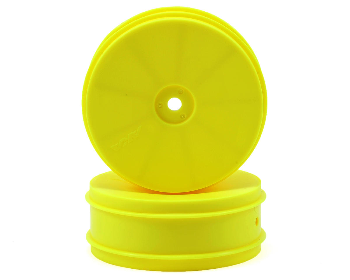 This is a pack of two yellow AKA Racing "EVO" 2.2 Front Wheels. These wheels are compatible with Associated B4 vehicles equipped with a 12mm front hex, as well as the Kyosho RB5 and RB6. AKA 1/10 EVO wheels have taken 1/10 scale buggy racing to the next level by adapting the L-shaped 1/8 buggy bead to the smaller 1/10 wheels. The EVO wheel has been redesigned to be stronger and stiffer. The EVO wheel features pre-punched vent holes in the wheel, combined with the L-shape bead that makes tire mounting much easier by giving you a wider and easily accessible gluing surface to ensure a strong bond between the tire and wheel.