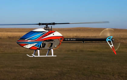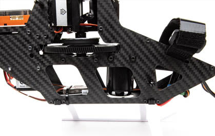 The all-carbon fiber and aluminum main frame takes rigidity to another level for a rock-solid flight experience. The carbon fiber main rotor blades feature an improved aerodynamic design with increases to efficiency and power. An oversized tail boom eliminates the need for boom supports and is crowned by an ABS plastic tail case improving vibration damping and performance.