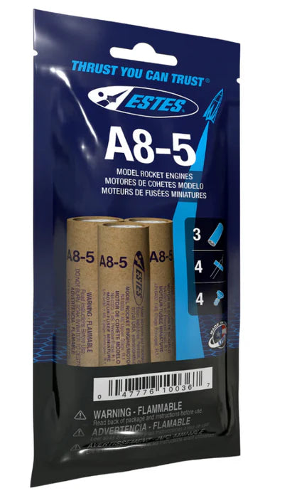 The Estes A8-5 engine is an upper stage stage engine designed for model rocket flight. This engine can also be used as a single stage engine in rockets weighing less than 5 ounces, including the engine. Each package includes 3 engines, 4 starters and 4 plugs.
