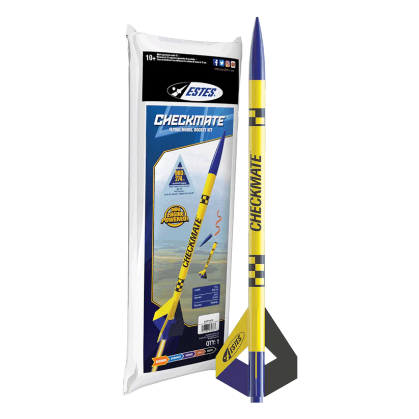 Experience the thrill of high-flying rocketry with the Checkmate model rocket! Featuring a unique, highly swept nested fin design, this rocket can easily reach 900 feet and comes in both single and 2-stage options.