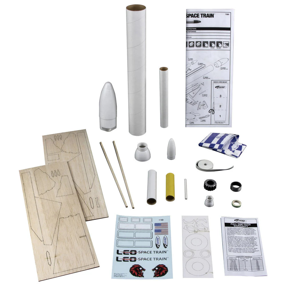 The Estes LEO Space Train kit allows you to bring to life the impressive features of this spacecraft. The kit includes precision-cut balsa fin and wing panels with laser-etched details, and an authentic-looking plastic engine nozzle and custom LEO Space Train "lion" graphic and logo. It can reach up to 300 feet (91 meters) on a single-stage C6-3 engine and return gently to Earth under its own 18-inch parachute.