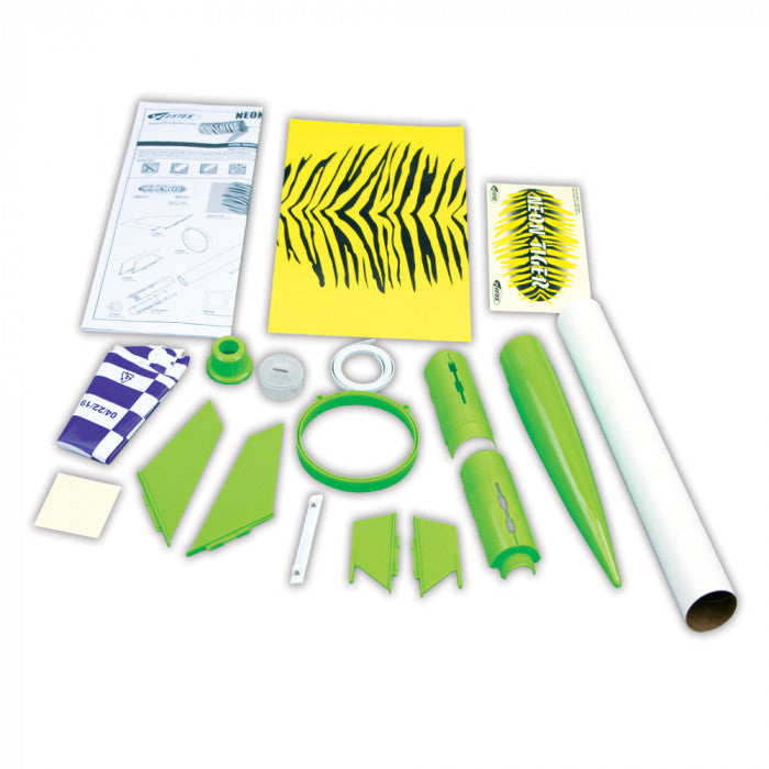 An easy-to-build rocket with detachable glider. Watch as the scoop-shaped flyer falls away at apogee and glides to a landing while the host rocket floats home via 15 inch parachute. The 24-inch long, tiger-striped, Estes Neon Tiger is a definite “must have” for all ages!