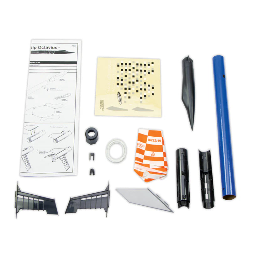 Perfect for entry-level rocketeers. You can easily snap together this Beginner level flying model rocket kit in 15 minutes or less. When completed, the Starship Octavius rocket kit will stand a full 20 inches tall. Self-stick decals and a sci-fi plastic molded nose cone gives it a slick jet-fighter look.