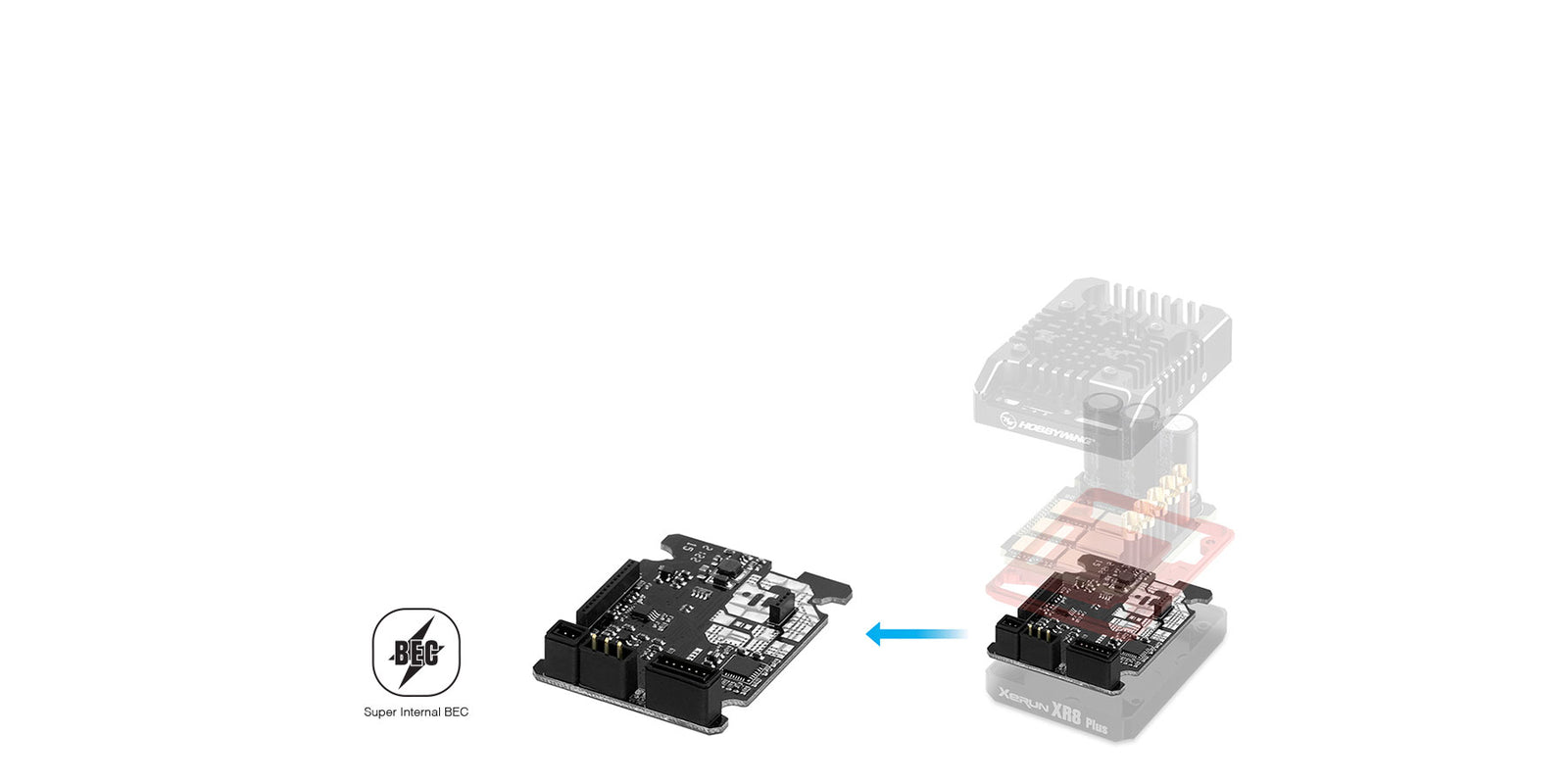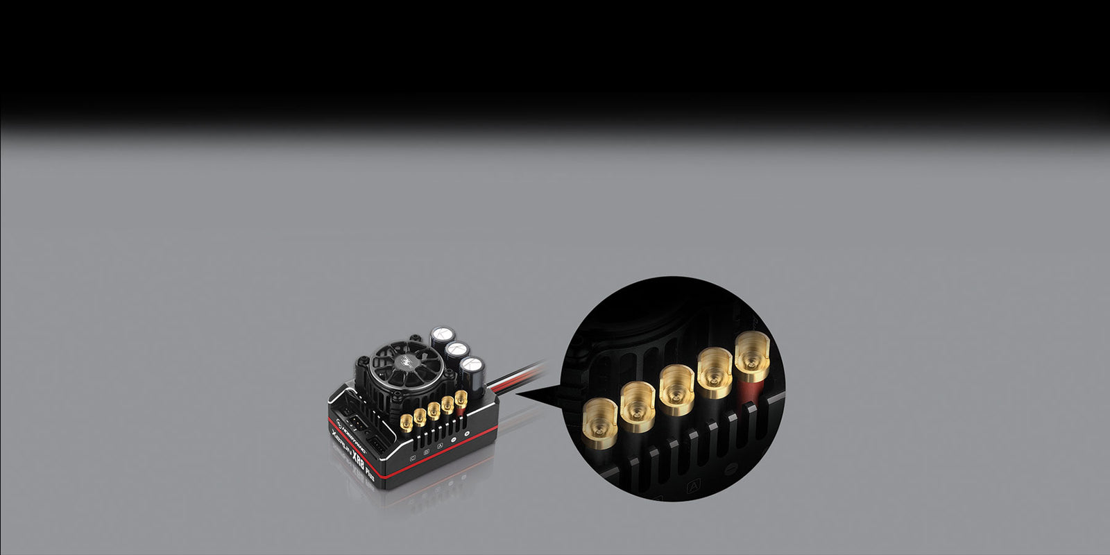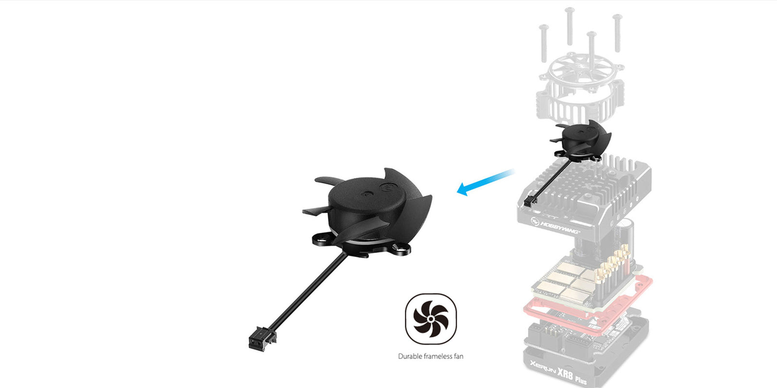 + HOBBYWING's patented FCD system. The focus of the XR8 Plus G2S, is the all new, and patented fan technology. Cooling to the ESC increases performance and reliability. The cooler the ESC can stay, the better it works. For many years, racers simply bolted on a larger or faster fan. This did move more air, however it also increased the power demands of the ESC's internal BEC. This creates internal temperature rises and wear and tear on the ESC's BEC that lead to reliability and performance losses. By allowing more air to flow through the frameless design, loads from the fan actually go down (less power draw) while the airflow and cooling are increased. This new cooling system ensures maximum airflow with no losses through higher fan power draw.