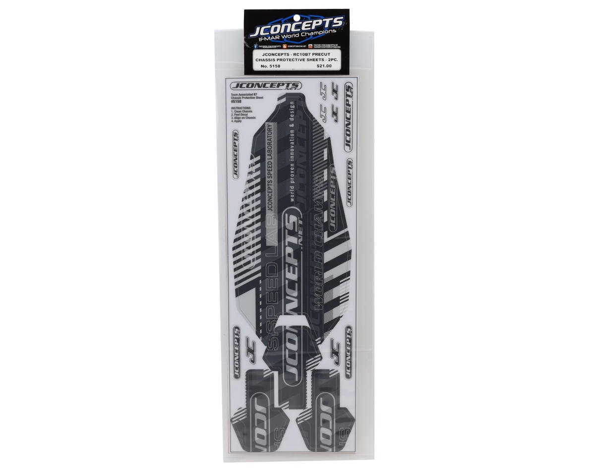 JConcepts Team Associated RC10B7 Precut Chassis Protective Sheets. Pre-cut to perfection, lining up to the popular RC10B7, the abstract design catches the eye and carries on a legacy of high-end chassis protectors. The 2-piece design, which includes three separate rear chassis pieces features italicized graphics in a high-speed fashion, embodies all that is great about competition.