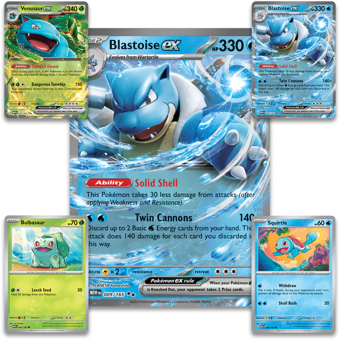 Venusaur and Blastoise have joined many a Trainer on adventures through the Kanto region and beyond—and now you can add them to your Pokémon TCG deck as heavy-hitting Pokémon ex! In this premium collection, you get Venusaur ex and Blastoise ex as foil cards with strong Abilities and attacks, plus foil cards of Bulbasaur and Squirtle, and an oversize card of Blastoise ex for display. On top of that, even more Pokémon are waiting for you inside 12 booster packs!