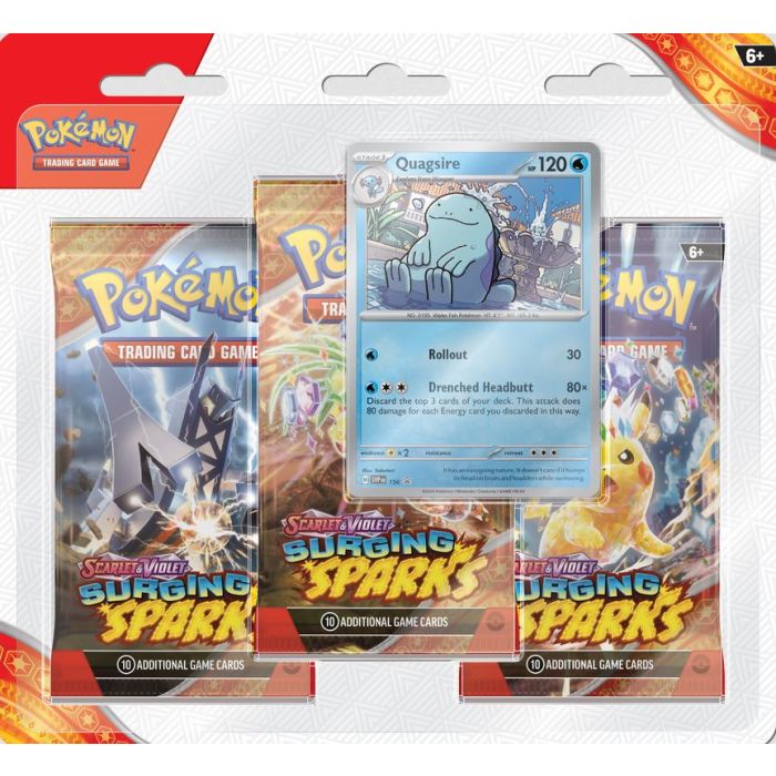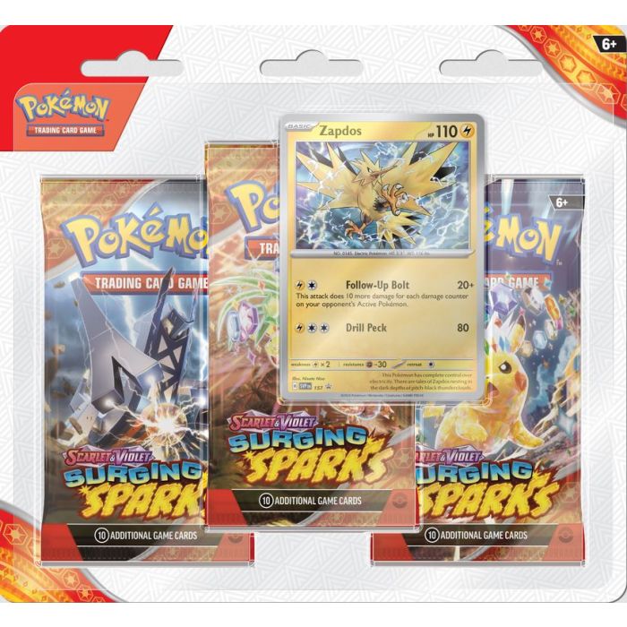 Terawatts of electricity crash down from the sky in a tropical paradise, setting the stage for the supercharged Pikachu ex! With the power of a Stellar Tera Pokémon ex, it lights up the shoreline, revealing a parade of dragon Pokémon led by the towering Alolan Exeggutor ex! Archaludon ex and Latias ex round out the horde, while new ACE SPEC cards and more new Pokémon ex bring surprises of their own. Currents crackle and dragons roar in the Pokémon TCG: Scarlet & Violet—Surging Sparks expansion!
