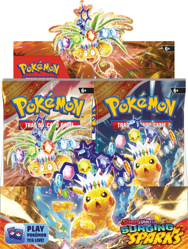 Terawatts of electricity crash down from the sky in a tropical paradise, setting the stage for the supercharged Pikachu ex! With the power of a Stellar Tera Pokémon ex, it lights up the shoreline, revealing a parade of dragon Pokémon led by the towering Alolan Exeggutor ex! Archaludon ex and Latias ex round out the horde, while new ACE SPEC cards and more new Pokémon ex bring surprises of their own. Currents crackle and dragons roar in the Pokémon TCG: Scarlet & Violet—Surging Sparks expansion!