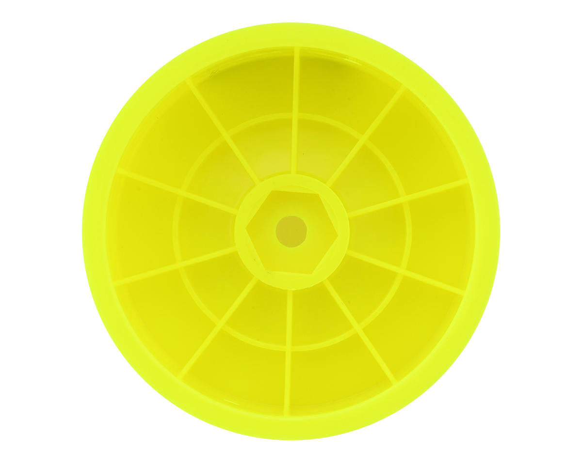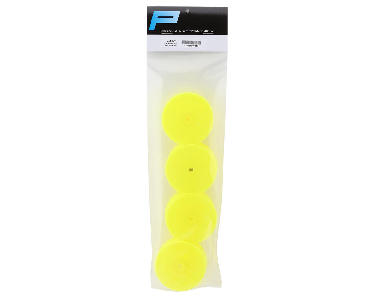 Pro-Motion 2.2" 4WD Front Buggy Wheels. Crafted with a focus on durability and weight reduction, these wheels are engineered using a tougher wheel material, tailored to excel on modern high-grip tracks. The inner lightweight rib design ensures optimal strength without unnecessary bulk, while advanced manufacturing techniques guarantee a balanced and true wheel. Featuring a small, lightweight inner rib on the mounting surface and integrated vent holes, these wheels stand out as the ideal choice for peak performance.