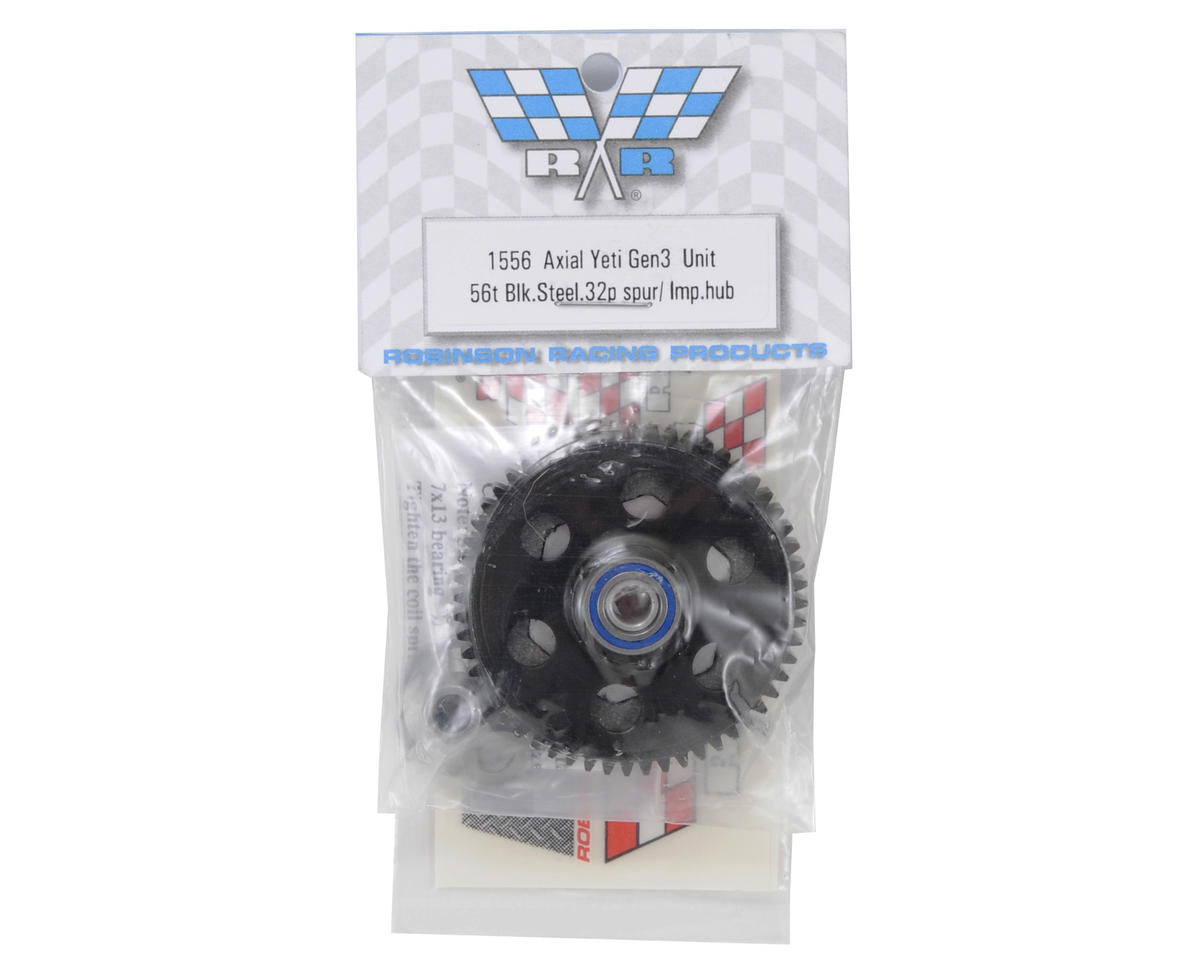 This is an optional Robinson Racing Axial Yeti Gen 3 Slipper Unit with Blackened Steel Spur Gear. GEN3 Slipper Units will not fail under the enormous load conditions of todays brushless motor systems. The GEN3 Slipper Unit is a captured design to prevent slipper pad blowout and deliver maximum power to the ground. The hi-performance hardened steel spur gear will not fail or strip. Strong and tough gear teeth handle all the power you can pour on the spur gear. Aircraft grade billet aluminum backplate will not bend or break. Increased surface area of the oversized pad insures dependable performance. Less total parts reduces flex and wobble in the spur gear and slipper unit. Choose from 56 or 64 tooth spur gears. Bearing, Steel Spur, Slipper Pad and Backplate included.