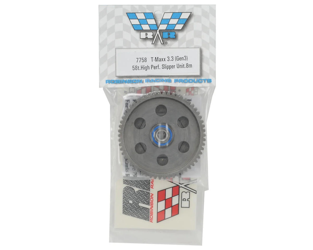 This is a optional Robinson Racing Gen3 Slipper Kit Steel Spur/Backplate, and is intended for use with the Traxxas T-Maxx 3.3. Robinson Racing GEN3 Slipper Units are over-engineered to meet the punishing demands of the most powerful brushless motor systems! GEN3 Slipper Units will not fail under the enormous load conditions of today's brushless motor systems. The new GEN3 Slipper Unit is a captured design to prevent slipper pad blowout and deliver maximum power to the ground. The hi-performance hardened steel spur gear will not fail or strip. Strong and tough 0.8 Mod/32 Pitch teeth handle all the power you can pour on the spur gear. Aircraft grade billet aluminum backplate will not bend or break. Increased surface area of the oversized pad insures dependable performance. Less total parts reduces flex and wobble in the spur gear and slipper unit. Bearing included.