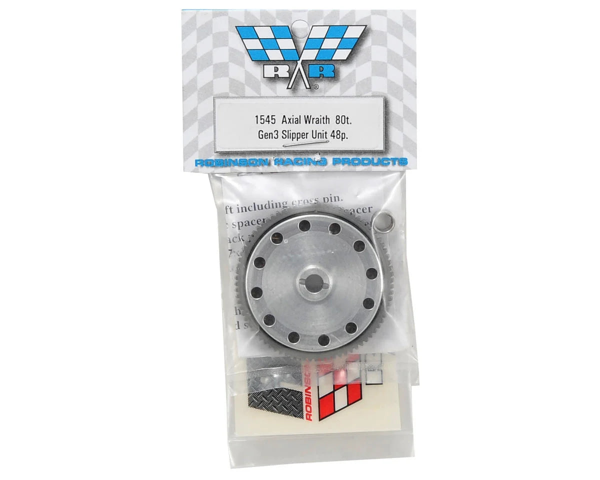 This is an optional Robinson Racing GEN3 Slipper Unit with an 80 Tooth Steel Spur Gear, and is intended for use with the Axial Wraith. GEN3 Slipper Units will not fail under the enormous load conditions of todays brushless motor systems. The GEN3 Slipper Unit is a captured design to prevent slipper pad blowout and deliver maximum power to the ground. The hi-performance hardened steel spur gear will not fail or strip. Strong and tough gear teeth handle all the power you can pour on the spur gear. Aircraft grade billet aluminum backplate will not bend or break. Increased surface area of the oversized pad insures dependable performance. Less total parts reduces flex and wobble in the spur gear and slipper unit. Bearing included.