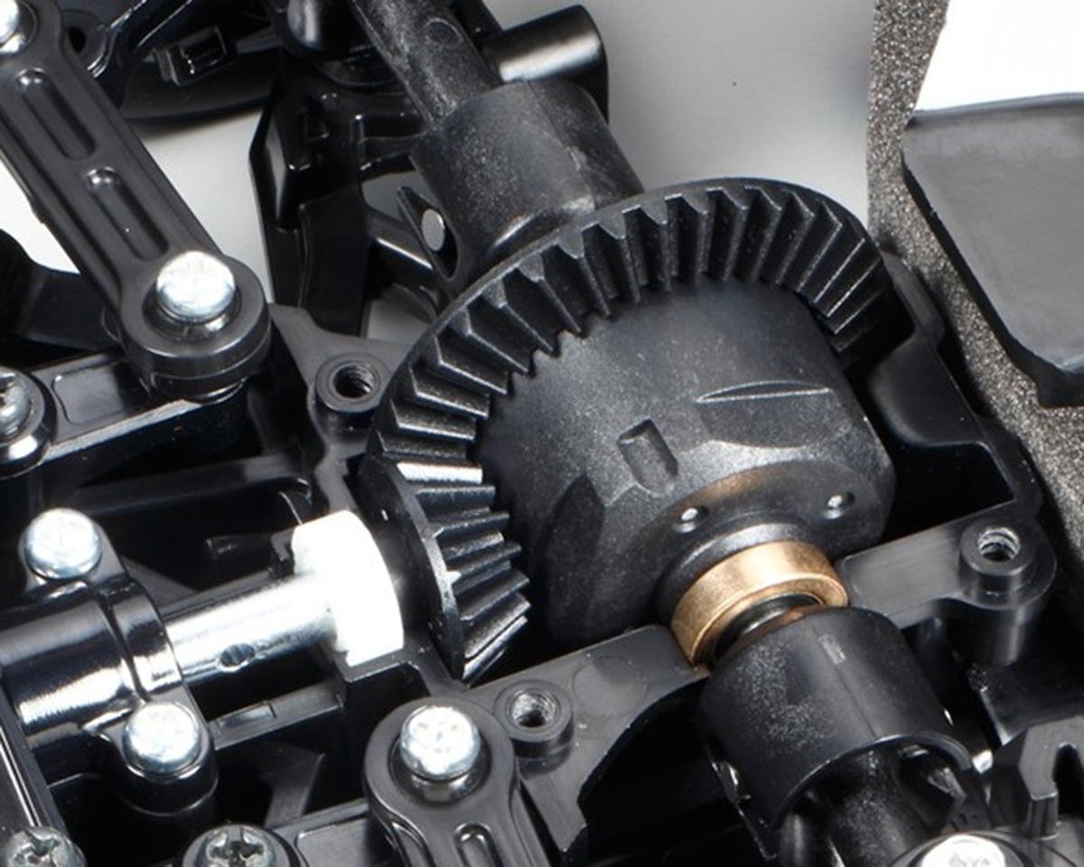 The TT-02 chassis, with its adaptable and balanced shaft-driven 4WD system, ensures excellent stability through a longitudinal layout featuring the battery on the left and the motor on the right. Its design incorporates identical left and right suspension arms and uprights for straightforward assembly, along with easily maintainable gearboxes. The chassis offers versatility with two wheelbases, two ground clearance settings, two tread setups, and a selection of ten gear ratios. Not only functional, it boasts aesthetic appeal with brake disc-shaped wheel hubs, stylish front bumper supports, gun metal color 10-spoke wheels, and sleek slick tires, delivering a sporty appearance.