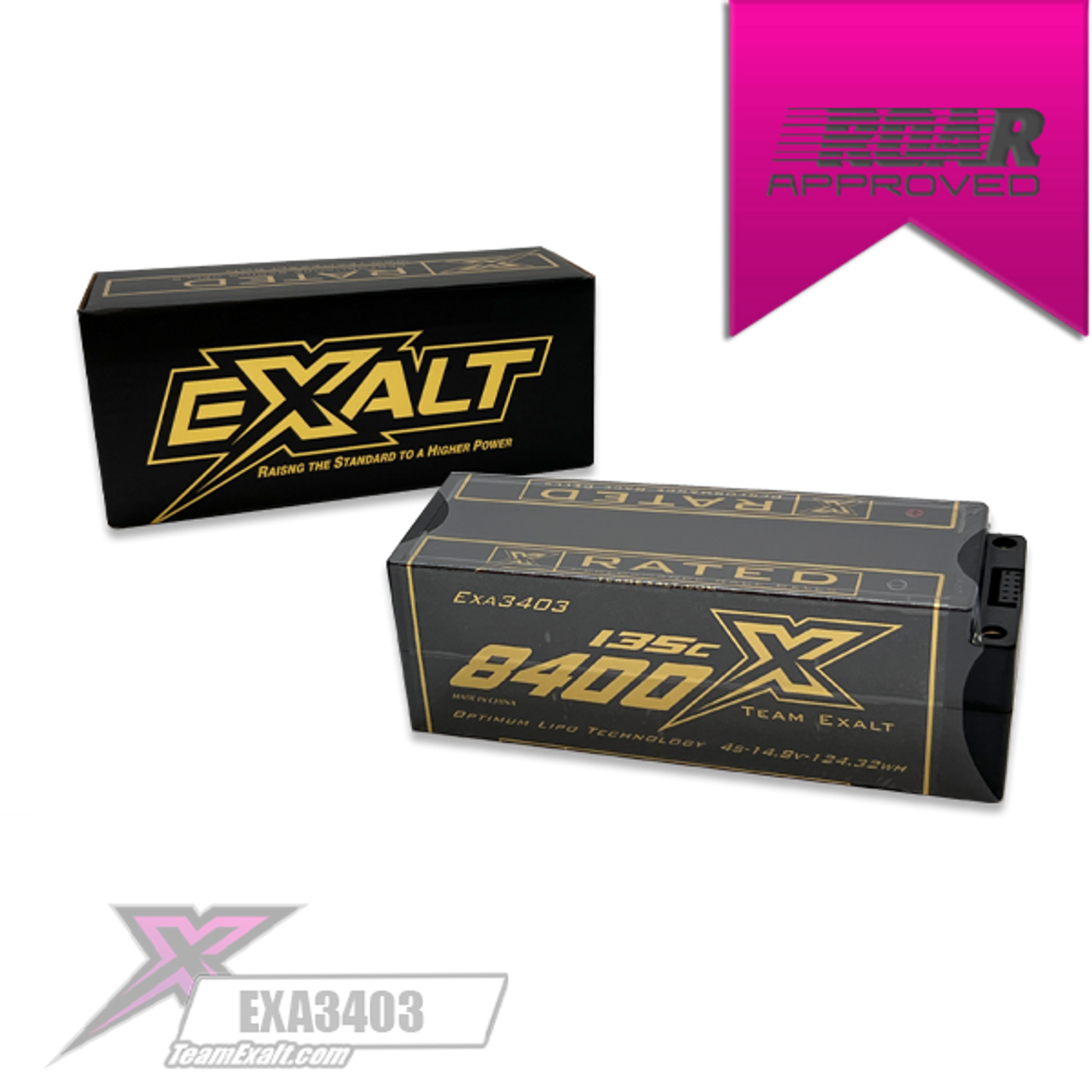 Looking for an edge in your next race? Look no further than the 8400 X-Rated High Performance Lipo battery! Featuring the newest chemistry providing durability while providing low resistance, and a flatter discharge curve.Team Exalt's X-Rated Lipo batteries Feature Silicon Graphene technology, which stabilizes the cells and increases their cycle life & efficiency.