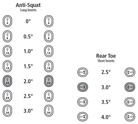 Team Losi Racing 22 3.0 Rear Suspension Insert Set. These are the replacement rear toe in and anti-squat inserts. Package includes seven pair of long anti-squat inserts and four pair of short rear toe inserts.