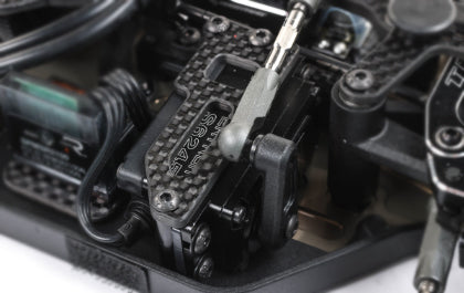 To keep the servo mounting from affecting the chassis flex, the servo is mounted hanging above the chassis. The mount only secures to the chassis near the chassis centerline, then uses rigid 2.5mm carbon fiber to support the weight and leverage of the servo to optimize steering performance and chassis flex. The V2 version also accommodates all servo off-sets.